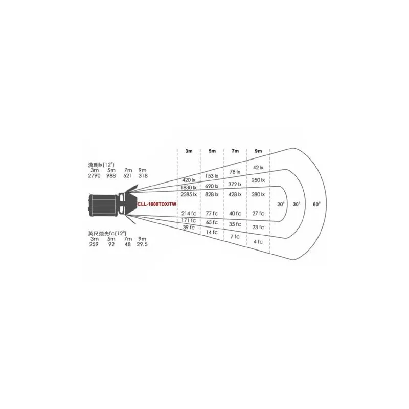 CLL-1600TDX оснащена линзой Френеля, что позволяет краям светового потока постепенно затемняться. Угол луча можно регулировать от 20 до 60 градусов.