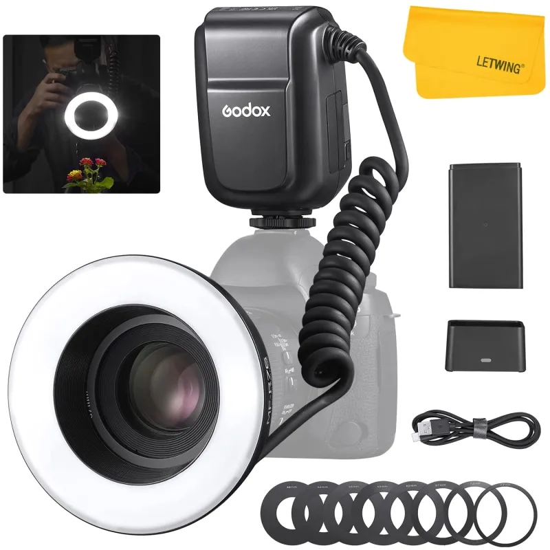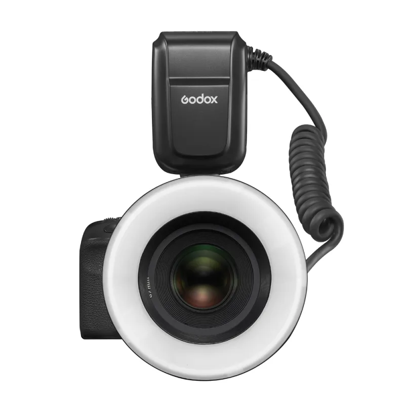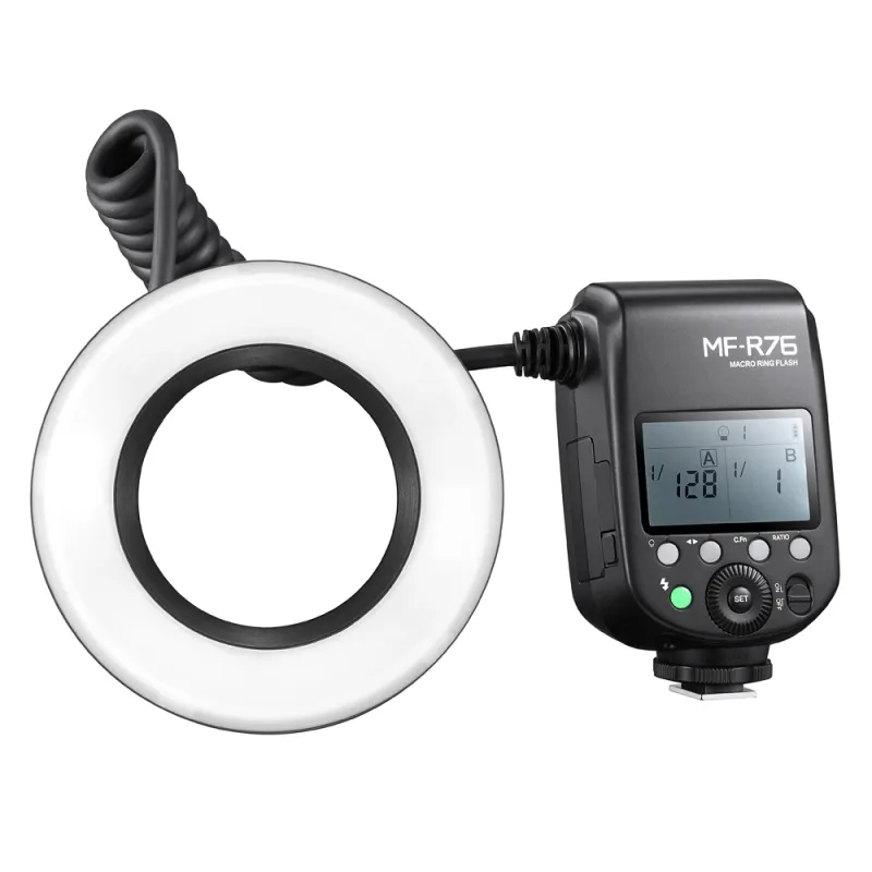 Совместимая с цифровыми зеркальными камерами Canon, Nikon, Sony, Panasonic, Olympus, Fuji и Pentax с байонетом hot shoe, кольцевая вспышка MF-R76 Macro Ring Flash от Godox освещает объект мягким и ровным светом, который идеально подходит для выявления мелких деталей крупным планом. Кольцевой свет состоит из двух компонентов: контроллера, который вставляется в hot shoe камеры, и кольцевой вспышки, которая крепится к объективу. В комплект Godox входят переходные кольца 49, 52, 55, 58, 62, 67, 72 и 77 мм для обеспечения широкой совместимости с большинством объективов. Блок управления питает систему от долговечной перезаряжаемой литиевой батареи, которая может обеспечить до 660 вспышек полной мощности. Ручной блок регулирует интенсивность света с шагом 1/3 EV от 1/1 полной мощности до 1/128, а на большой ЖК-панели удобно отображаются настройки вспышки, что облегчает навигацию и управление.