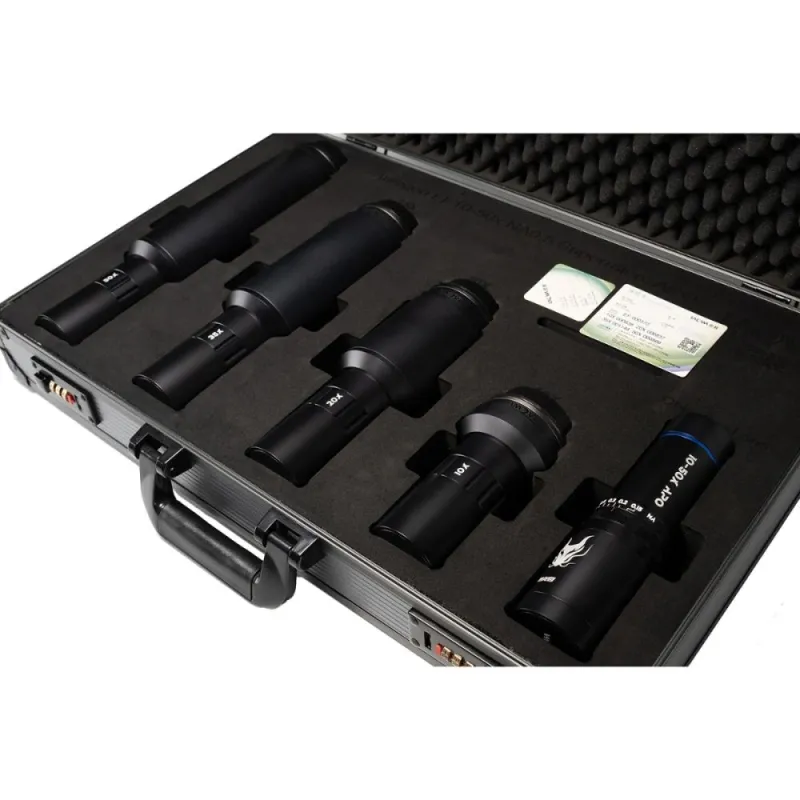 It consists of four different tube lenses that are connected directly to the camera and a front lens, which is each mounted on the tube. The tubes offer magnifications of 10X, 20X, 35X and 50X. The length of the tubes varies between 112 mm and 253 mm and the weight between 370 and 465g. The front lens has a length of 167 mm with a diameter of 50 mm and a weight of 447g.