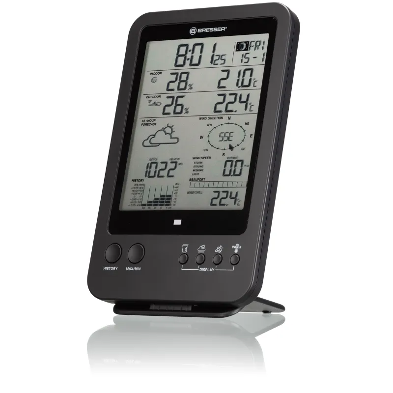 The 5-in-1 outdoor sensor transfers reliably all measured values for wind speed, wind direction, humidity, temperature and precipitation rate to the base station. On the clearly structured display of the base station not only these values can be read but also a multitude of history data. The latter allows the internal storage and evaluation of measured data over a period of 24 hours. From the collected measured data, the weather station calculates a very reliable local weather trend forecast for the next 12 hours, depicted by six graphic symbols on the display. For minimum and maximum values an individual alarm can be programmed, which gives an acoustic and a light signal when the defined value is reached. For outside temperatures of -3 °C and below a special alarm for frost/ice warning can additionally be activated. A poor indoor climate often involves health risks especially for children and the elderly. The BRESSER Weather Station 5-in-1 offers you a smart feature to deal with this. The indoor climate indicator informs steadily about the indoor climate with a symbol. Furthermore the BRESSER Weather Station 5-in-1 features a radio controlled time and date setting (DCF time signal) . Already a few minutes after switching the device on the current Central European Time (CET) and the date with weekday are displayed automatically. For the ''moonstruckers'' also the different phases of the moon are shown. An alarm function with snooze mode is also integrated.