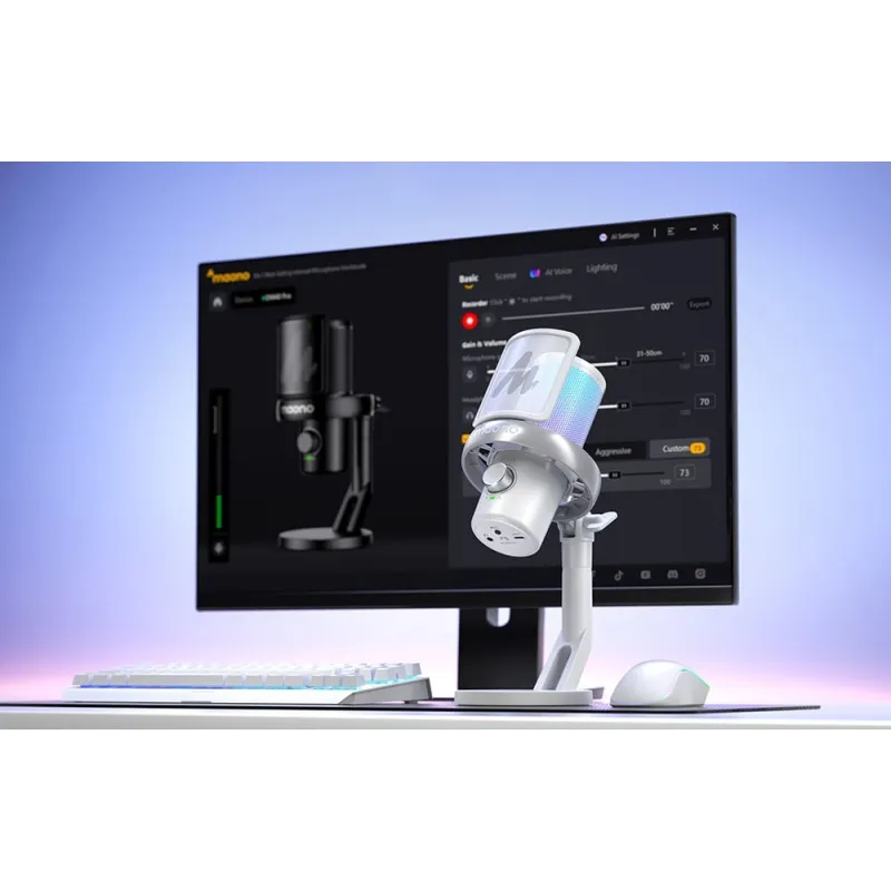 Эстетика микрофона дополняется встроенной RGB-подсветкой с более чем 16 миллионами возможных цветовых настроек. Есть 3 режима освещения и 13 предустановленных цветов, которые можно персонализировать в приложении Maono Link. Элементы управления громкостью микрофона и прослушивания, быстрая смена источников звука и кнопка отключения звука расположены на передней панели устройства для интуитивного управления без необходимости тянуться к компьютеру.