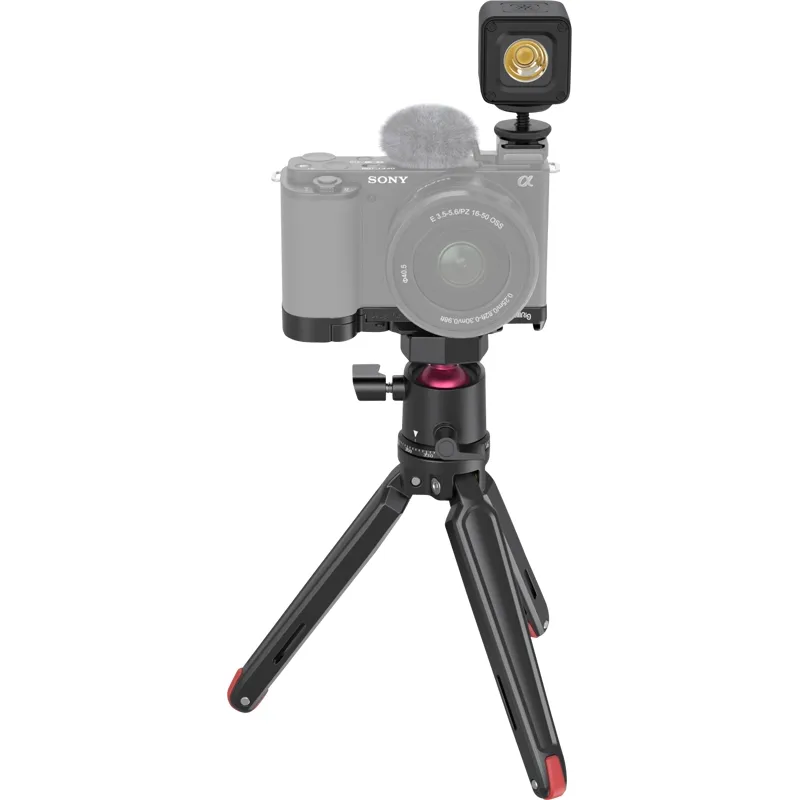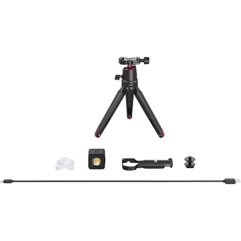 SmallRig Vlogger Kit for Sony ZV-E10 3525 is a portable shooting kit designed for vloggers to improve the video quality and make it easier for vlogging. The kit includes a base plate, Arca-type tripod and mini LED light, which suits handheld selfies and tripod shooting. Its baseplate is attached to the camera with a 1/4" D-ring screw. The battery door features an open-and-close lever that maintains a good grip experience without affecting battery replacement and overall fitness; the Arca-type tripod supports hand-held selfies and a quick switch between hand-held and tabletop shooting modes. The compact mini portable LED light with four brightness levels can be widely used for macro shooting scenes such as models, toys in small spaces, and other scenes.