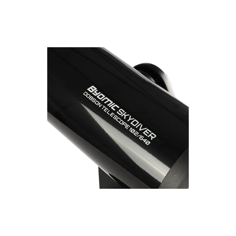 The Byomic SkyDiver 102/640 is equipped with a Dobsonian mount which makes it easy to move the telescope azimuthally (horizontally and vertically). Because the Dobson telescope only needs to be placed on a flat surface, you do not need much space and you can start observing immediately. The Dobson mount also ensures that the telescope can be stored quickly and takes up little space. The Byomic SkyDiver 102/640 has a handle in the mount, which makes it easy to carry and move the telescope.
