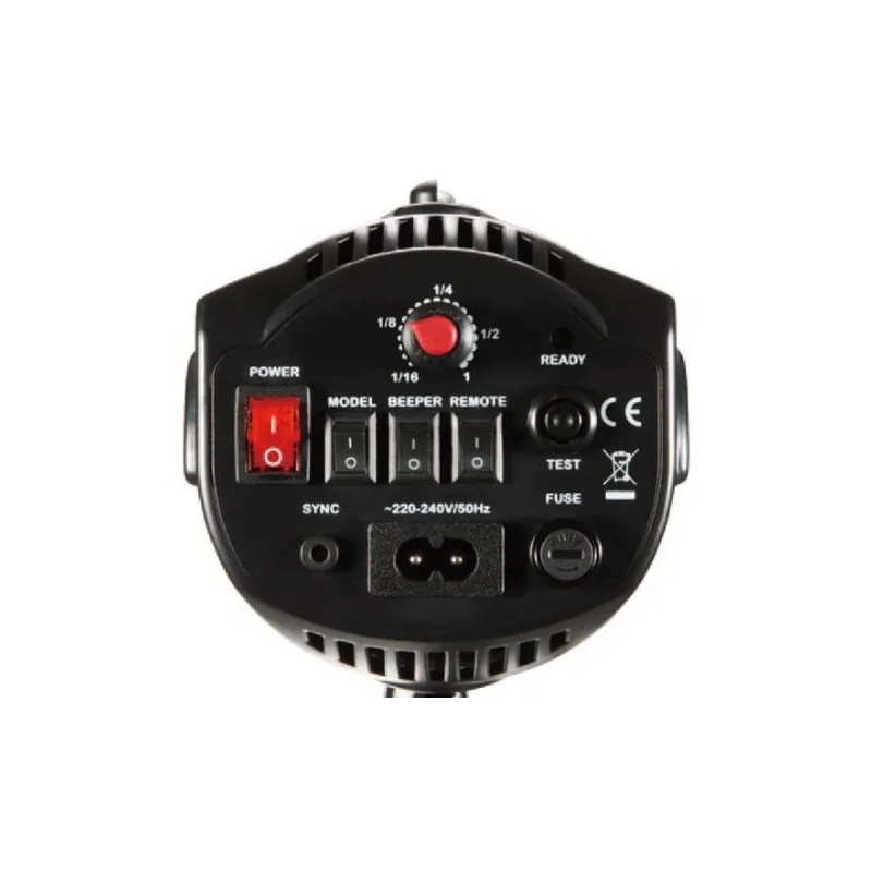 Included in delivery is the modern flash unit MT-250D. The flash power of this studio flash is stepless adjustable from 1/16 up to full power with a charging time of 1 up to 2.3 seconds on full power. The flash unit is equipped with a 50W model light and a slave sensor, both can be switched on or off.