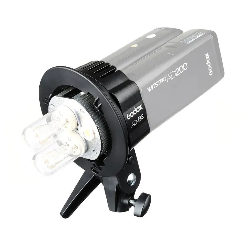 Godox AD B2 Dual Power Flash Head With this Godox AD B2 Dual Power Flash Head you can turn two Godox Witstro AD200 strobes into one powerful flash head. All you have to do is insert the flash tubes of the AD200 strobes into the AD B2. You now have a flash head with a light output of 400W /s and a light modification friendly Bowen S type mount. ,