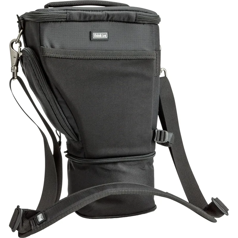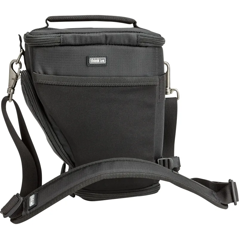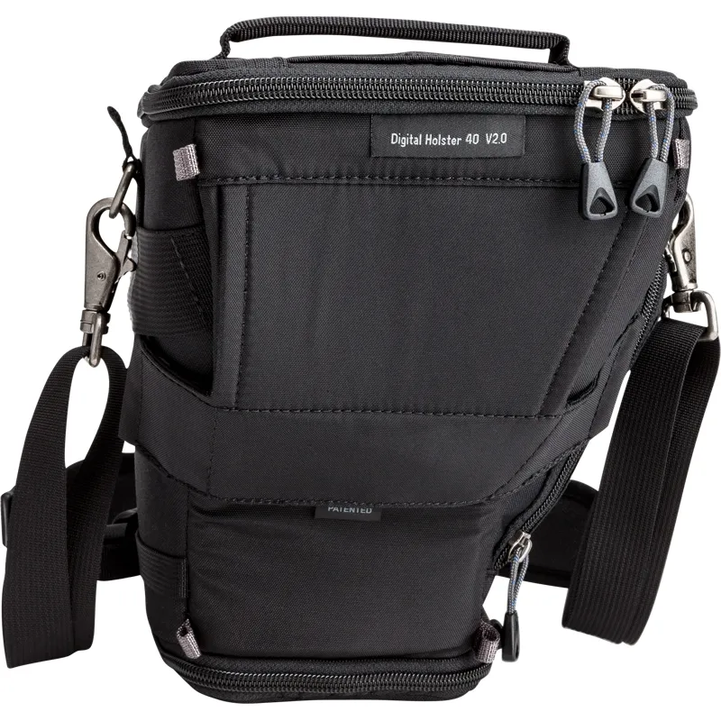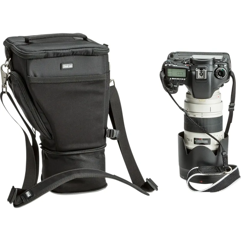 Unique holster developed for gripped DSLR with a 24-70mm f/2.8 lens hood in shooting position