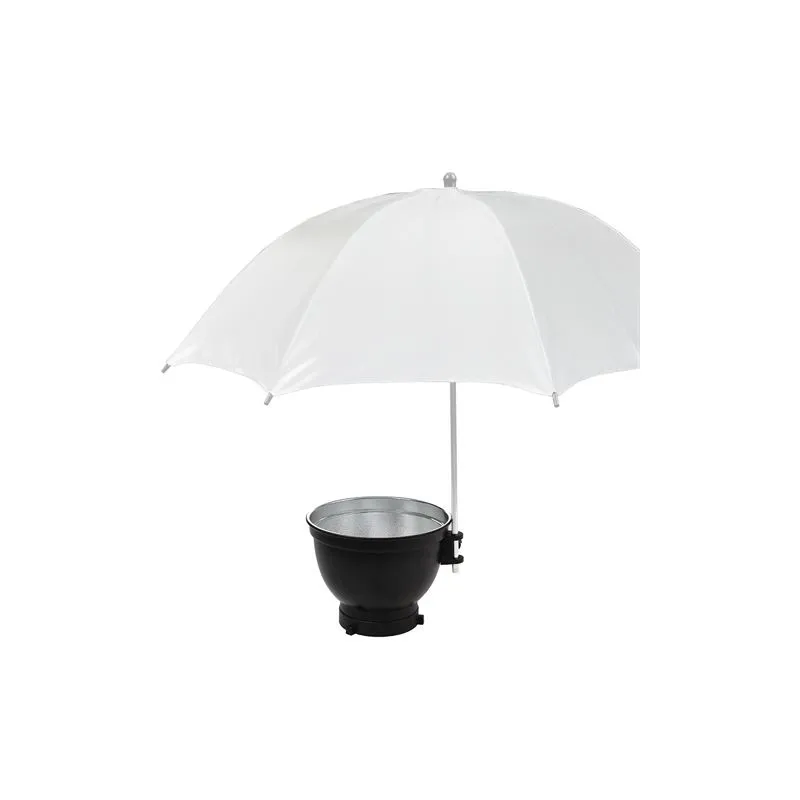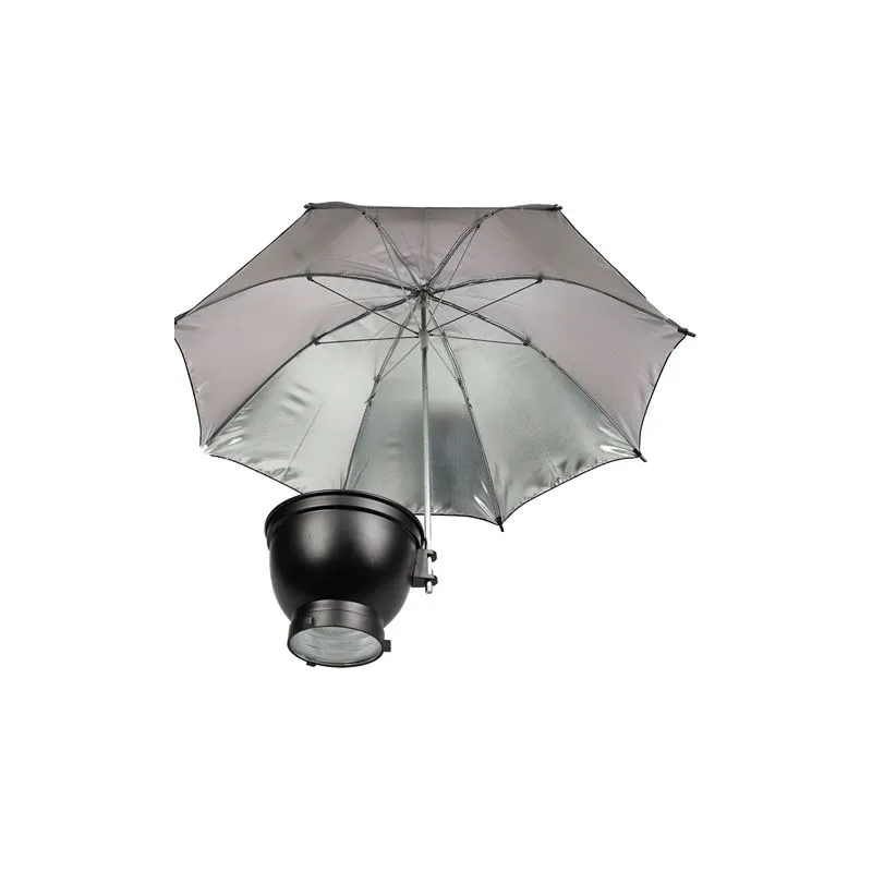 If you want to direct the light of your flash or continuous light more and optionally make it softer, the SK-SR18 reflector can also be used in combination with an umbrella. The SK-SR18 reflector can make the light a bit narrower. As you can see in the pictures, there is a special ring with which you can attach the umbrella to the reflector. The umbrella you can use in combination with this reflector can be found at optional accessories