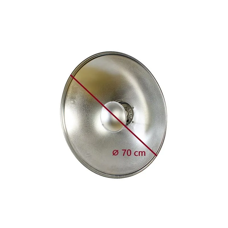 The StudioKing SK-BD700 consists of a beauty dish (? 70 cm) that comes with a honeycomb, diffusion cloth and a reflector. As the name suggests, a beauty dish allows you to photograph people in the most beautiful way. It provides a wide spread and a nice contrast, so that details of a person (e.g. skin tones or muscles) are highlighted in a beautiful way. Compared to a white beauty dish, a silver color makes details stand out even more.