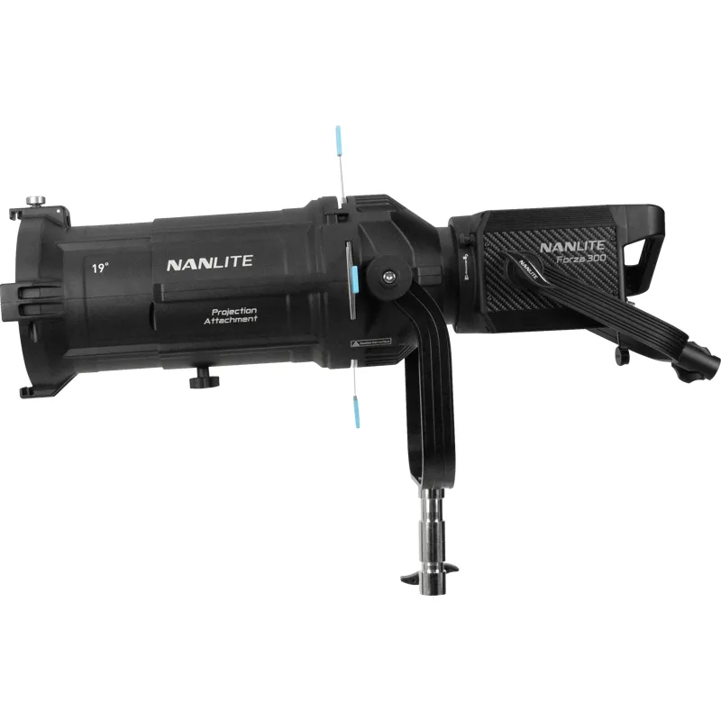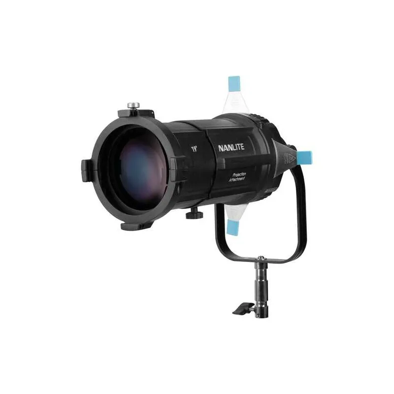 The Nanlite Projection Attachment for Bowens Mount with 19° Lens allows you to achieve complex and bold lighting effects using lights that have a Bowens mount, such as the Nanlite FS Series and larger Forza monolights. The Projection Attachment dramatically increases the output of the light you use it with. For example, the Forza 500 is over 964% brighter when this 19° version attachment is used. Included with the attachment are an array of highly creative light-shaping tools: a focusable lens, internal shutters, gel inserts, and gobos. It also supports an optional adjustable iris.