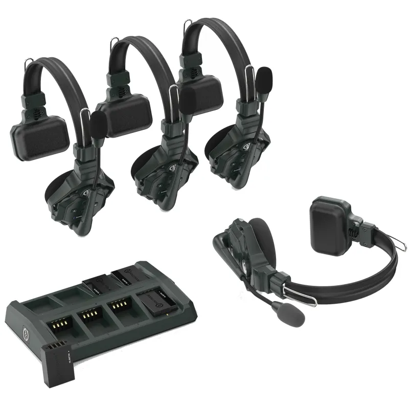 Каждый интерком наушник комплектуется запасной литиевой батареей для удобной замены в полевых условиях. Батареи перезаряжаются внешним зарядным устройством, требуя всего 2,5 часа для полной зарядки, обеспечивая до 10 часов работы для удаленного наушника и 5-6 часов для основного, в зависимости от количества подключенных удаленных наушников.