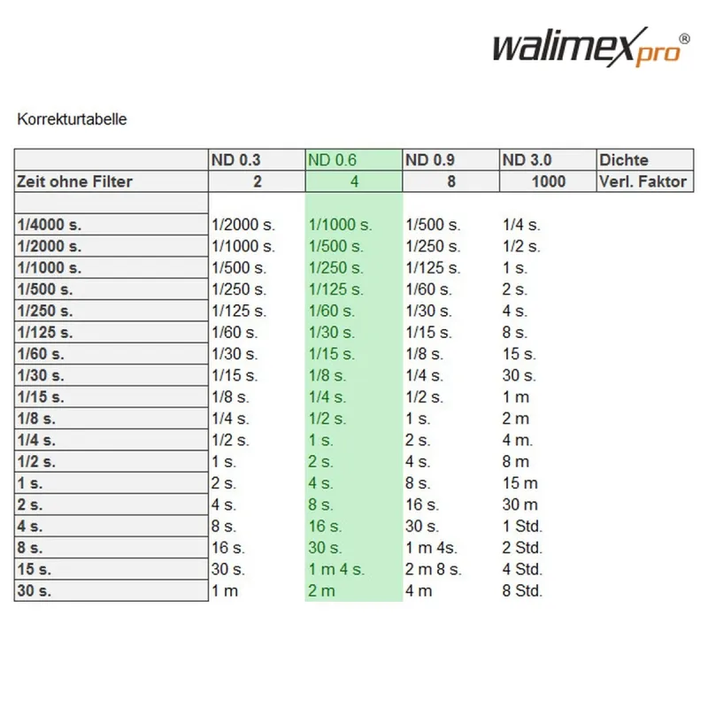The neutral-density filter from walimex pro extends the exposure time by 2 apertures (factor 4), which enables you to achieve e.g. motion blurring and flow effects (e.g. on waterfalls). It is therefore mainly used in landscape photography. It also ensures uniform darkening of the image and reduces the light quantity, in order to achieve less focal depth with open aperture.