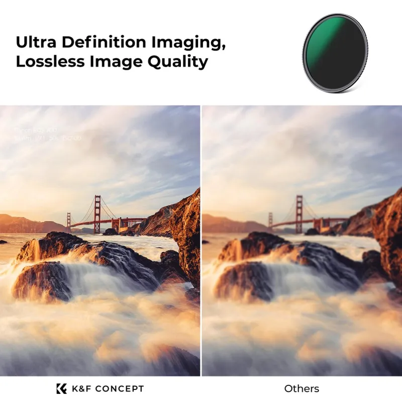 The K&F Concept Fixed ND Filter Set offers photographers a versatile solution for various shooting scenarios. With a selection of three filters, including ND8 (3 stop), ND64 (6 stop), and ND1000 (10 stop), this kit caters to portrait, landscape, long exposure, and variable lighting needs. Crafted from high-quality Japanese optical glass with double-sided polishing, these filters deliver excellent image sharpness while minimizing stray light and reflections through an oxidized sandblasted surface. The 24-layer nano coating ensures color neutrality, reduces lens reflections, and provides waterproof and oil-proof properties, eliminating color casting and making it an essential tool for landscape photography. The CNC trapezoid pattern frame design enhances rotational friction, simplifying installation and removal. For added convenience, the kit includes a waterproof pouch with an independent compartment to prevent filter scratches and three single vacuum-packaged cleaning cloths that are portable and easy to maintain. This all-in-one kit is a photographers travel-friendly companion for diverse shooting scenes.