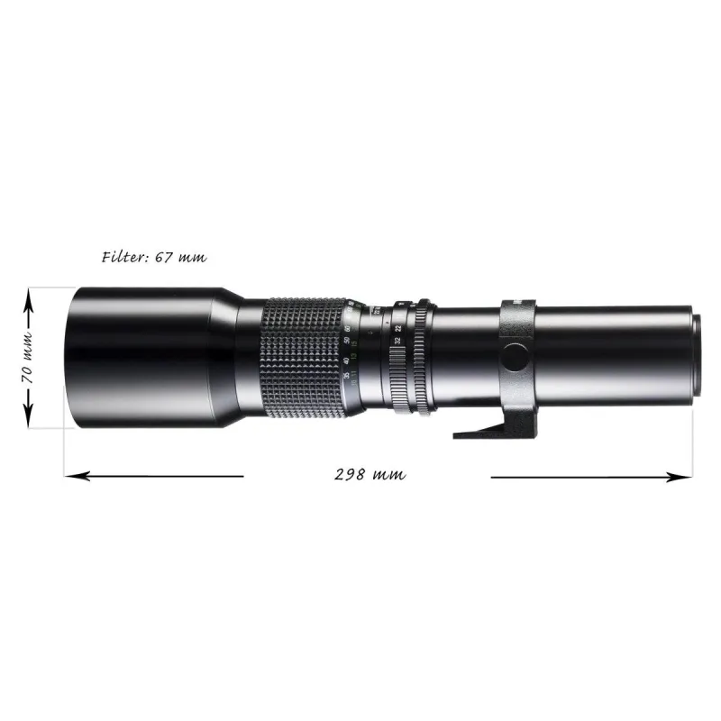 Объектив walimex 500/8.0 имеет фокусное расстояние 500 мм и скорость объектива 1:8-32, которая устанавливается с помощью кольца aperture. Прочный металлический корпус, высокое качество изготовления и механики обеспечивают хорошее качество изображения. С помощью прочного кольца для крепления на штатив объектив можно закрепить на штативе с оптимальной точкой равновесия. Фокусировка осуществляется вручную. Объектив можно использовать с приоритетом aperture и ручной установкой экспозиции. Благодаря простоте управления объектив особенно подходит для начинающих.