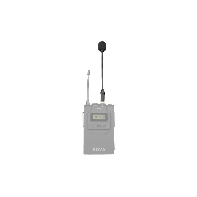 This microphone is suitable for use with the wireless transmitters of the BY-WM4, BY-WM5, BY-WM6 and BY-WM8 (Boya) as well as the UwMic9/UwMic15 (Saramonic). You can find these products with the optional accessories.