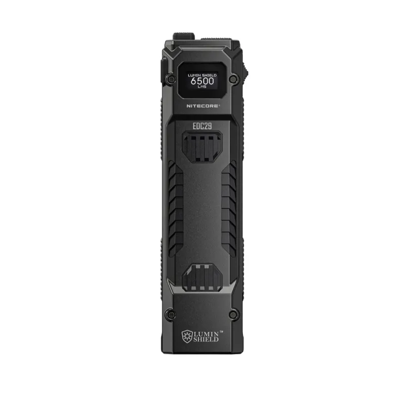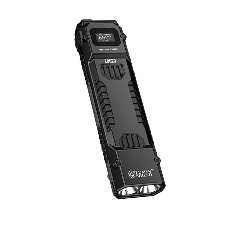 С прочным корпусом из углеродного волокна и нержавеющей стали, EDC29 обеспечивает надежный захват и устойчив к давлению и изгибу. Несмотря на свою прочную конструкцию, фонарь весит всего 160 г. Встроенный аккумулятор 2500mAh обеспечивает до 61 часа работы, а OLED-дисплей отображает информацию в реальном времени, такую как яркость и состояние батареи. С водоотталкивающей защитой IP54 и устойчивостью к падениям с высоты до 1 метра, EDC29 надежен в различных условиях.