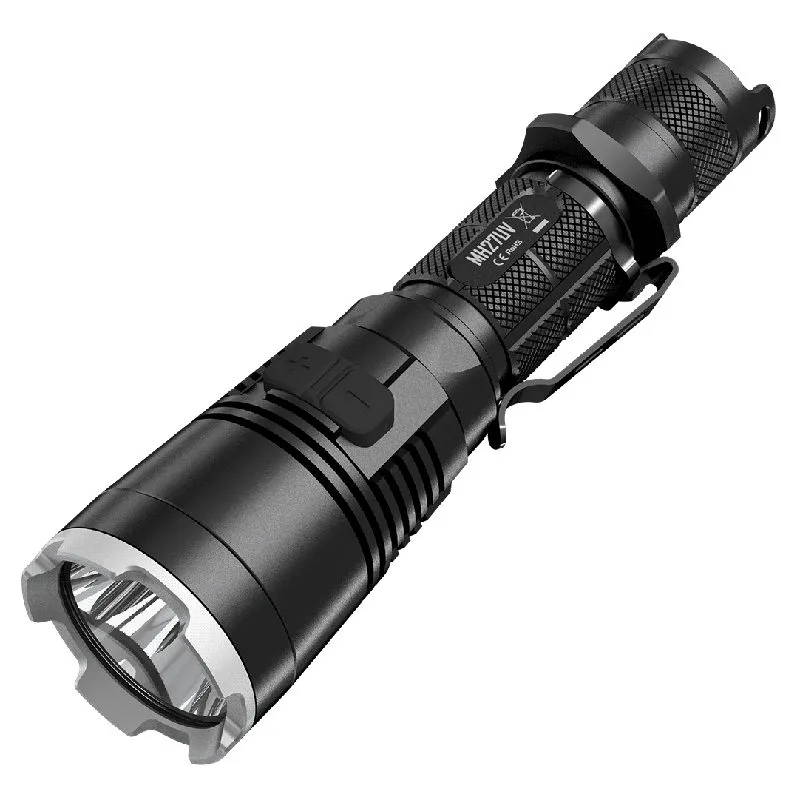 The Nitecore MH27UV is a rechargeable tactical torch with built-in 500mW 365nm UV lamp. The torch is equipped with the powerful Cree XP-L HI V3 LED with a light output of 1000 lumens. Together with the specially shaped reflector, the LED provides a beam with a range of 364 metres.