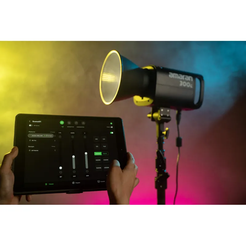 Благодаря конструкции в стиле монолампы, 300c оснащен полноцветным интегрированным интерфейсом управления, который элегантно вписывается в головку лампы и становится продолжением вас. Переключайтесь между точной настройкой CCT и 360º HSI простым нажатием на две ручки управления без лишних хлопот.