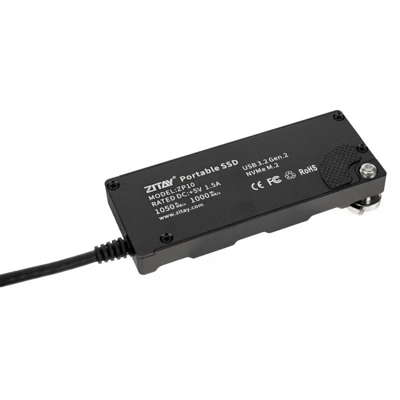 Кейс для SSD-накопителя Zitay ZP10 M.2 NVMe - это портативное решение для преобразования традиционного SSD в переносной накопитель, оснащенный кабелем USB-C 3.2 второго поколения. После подключения к носителю вы получите возможность быстрой и эффективной передачи данных. Технология PCle NVMe позволит вам достичь скорости чтения до 1050 МБ/с и записи до 1000 МБ/с. Прочное соединение корпуса и кабеля предотвращает повреждение интерфейса при частом подключении и отключении. Специальные канавки в корпусе и силиконовая прокладка обеспечивают оптимальное рассеивание тепла. Устройство также оснащено индикатором питания и винтом 1/4" для быстрого и удобного крепления, например, на кожух камеры. Основные характеристики продукта Корпус, позволяющий подключить M.2 NVMe SSD к устройству, оснащенному USB-C, совместим с фотоаппаратами, видеокамерами и компьютерами Эргономичный дизайн для оптимального теплоотвода Изготовлен из легкого и прочного авиационного алюминиевого сплава Максимальная скорость записи данных 1000 МБ/с Максимальная скорость чтения данных 1050 МБ/с Винт 1/4" для удобного монтажа в резьбовое отверстие Наклонное кольцо, встроенное в головку винта, облегчает затягивание и ослабление Удобная установка M.2 NVMe SSD внутри корпуса Быстрая передача данных Выбрав корпус Zitay ZP10, вы можете быть уверены, что при работе с устройством вы будете использовать весь потенциал установленного внутри него M.2 NVMe SSD. Максимальная скорость записи данных составляет 1000 МБ/с. Для записи - до 1050 МБ/с. Твердотельный накопитель M.2 NVMe не входит в комплект и должен приобретаться отдельно. Идеальный выбор для видеографов Корпус Zitay ZP10 M.2 NVMe SSD - идеальный выбор для тех, кто хочет записывать видеоматериалы на внешний SSD, подключаемый к фотоаппарату или видеокамере через порт USB-C. Благодаря сверхбыстрой скорости записи вы сможете записывать видео в самом высоком качестве, не беспокоясь о том, правильно ли сохранены файлы. Многолетний опыт бренда Zitay - это гарантия стабильной передачи данных и безопасной записи информации на носитель. Удобная установка После размещения твердотельного накопителя M.2 NVMe в алюминиевом корпусе достаточно подключить интерфейс к выбранному вами устройству. Комплект сразу же готов к работе, о чем вас проинформирует светодиодный индикатор. Дополнительные источники питания для носителя не нужны. Корпус накопителя обеспечивает оптимальную защиту, а специальный крепежный винт 1/4", оснащенный поворотным кольцом для легкого затягивания и откручивания, обеспечит удобную установку на риг или кейдж. Надежное соединение Использование встроенного кабеля обеспечивает надежную передачу данных без риска вывиха кабеля из корпуса. Благодаря использованию высококачественного аэрокосмического алюминиевого сплава, Zitay ZP10 гарантирует достаточную прочность и устойчивость к повреждениям. С таким корпусом вы можете не беспокоиться о потере данных из-за случайного удара по диску. Эффективный отвод тепла Корпус Zitay ZP10 оснащен усовершенствованной системой отвода тепла. В устройстве используется специальная силиконовая прокладка. Она обеспечивает более высокий коэффициент теплопроводности. Однако это еще не все. Использование системы продольных канавок - еще один способ увеличить площадь поверхности корпуса, которая эффективно рассеивает тепло. Технические характерис