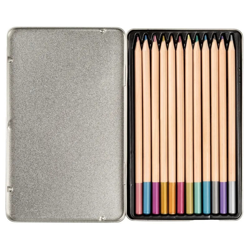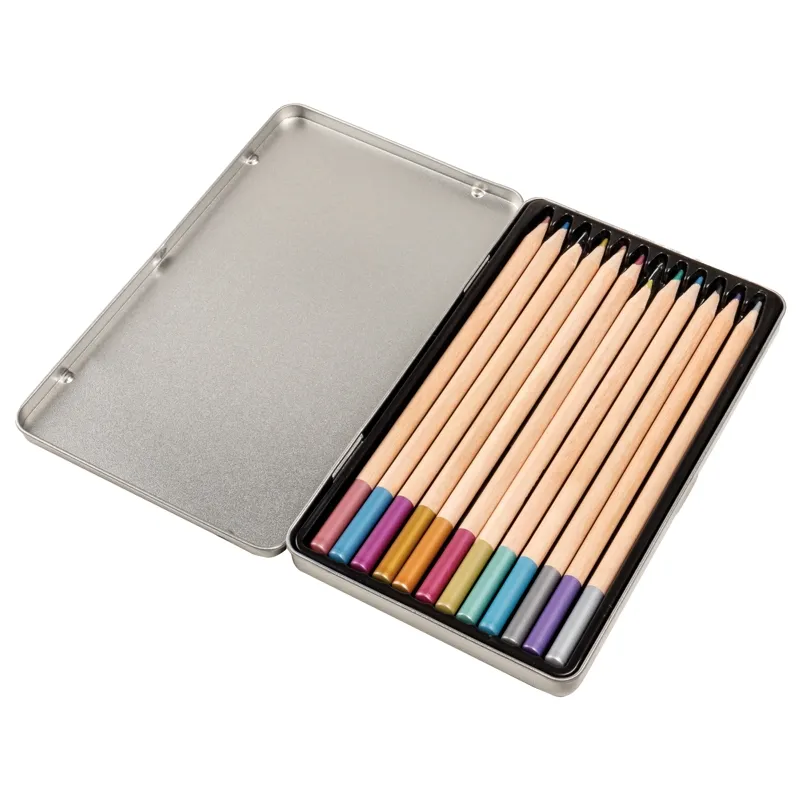 12 небьющихся деревянных мелков в классическом шестиугольном формате для безграничного творчества. Насыщенные цвета, подходят для светлой, цветной или темной бумаги. 12 карандашей разных цветов, упакованные в практичную металлическую коробку с глянцевым металлическим покрытием Упаковка: 12 штук в металлической коробке