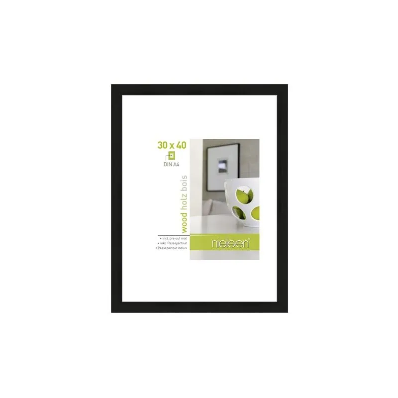 The 8988046 Apollon from Nielsen is a black picture frame suitable for one picture. You can insert a picture of 30x40 cm in this frame. A passe-partout is also supplied for 21x29,7 cm pictures. The picture frame is characterized by its wooden look. The total dimensions, including the frame, are 34x44 cm.