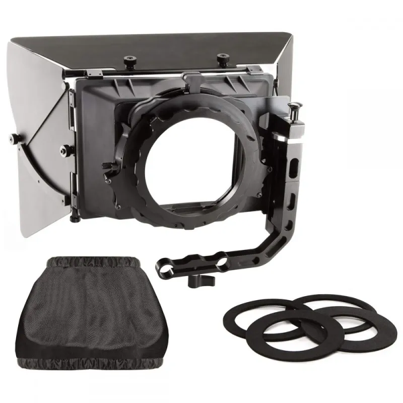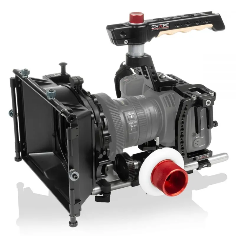 The SHAPE 2-Stage 4 x 4" Matte Box accepts lenses with up to a 105 mm front outside diameter. The main frame made of carbon fiber. It mounts to 15 mm LWS rods and utilizes a swing-away design, which lets you perform quick lens changes without having to remove the matte box from your rods. You can adjust the height of the matte box in relation to the rods, which comes in handy when your lens center to rod center height is slightly off from the standard. Two rotating filter stages support the use of 4x4" filters. The matte box comes with a top flag (eyebrow), side flags, six matte box donuts in 65, 77, 85, 88, 100 and 105 mm sizes, and elastic donut. The matte box also has a rear opening of 100 mm for lenses. The included anti-reflection donuts prevent light behind the camera from reflecting off any filters in the matte box and degrading the image. Included with the matte box are anti-reflection donuts for lenses with a front outside diameter of 65, 77, 85, 88, 100, 105 mm. The included elastic donut supports lenses with a front outside diameter between 65 and 105 mm, and it is especially useful with lenses that grow and shrink as you change focus or zoom. The side flags incorporate a hook design as a safety feature where they attach to the matte box. This helps prevent them from falling out of the matte box should the lockdown thumbscrew loosen accidentally. The swing-away bracket incorporates a height adjustment, enabling you to compensate a total of 0.65" vertically. This allows you to use this matte box with a variety of camera/rod support combinations that may vary slightly from the industry standard 85 mm distance from LWS rod center to lens port center.