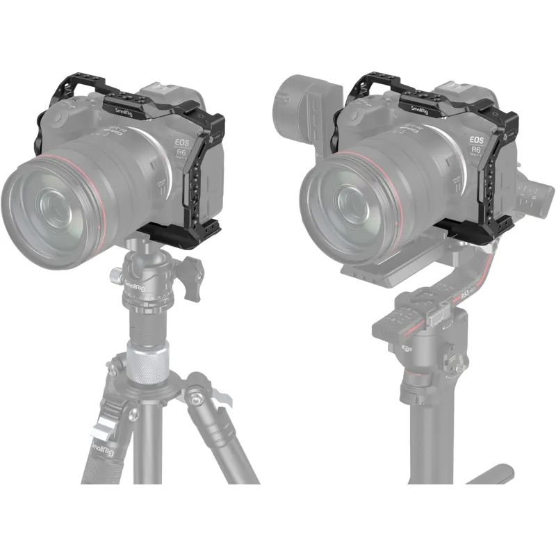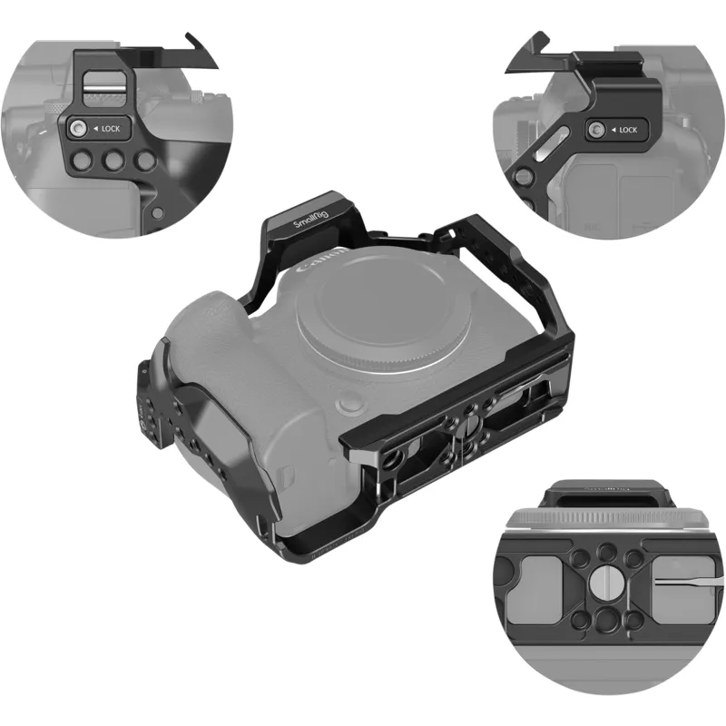 SmallRig Cage for Canon EOS R6 Mark II 4159 is designed to provide protection and attach accessories. It locks the camera via one 1/4"-20 screw at the bottom and one side lock adapter on both sides, with rubber pads preventing scratches. The cage maintains access to the camera button, card clot, screen, and battery door and comes with multiple accessory mounts.
