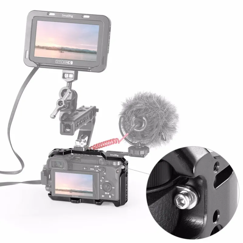 SmallRig Cage for Sony A6100/A6300/A6400/A6500 CCS2310. Cage is designed to provide protection and mounting threads for accessories such as monitor, microphone and light. The cage secures to the bottom of camera and features a m2.5 threads as a second lock point on the right side to prevent the camera from twisting.
