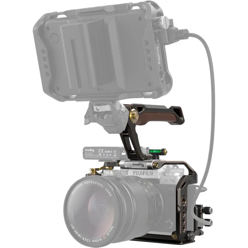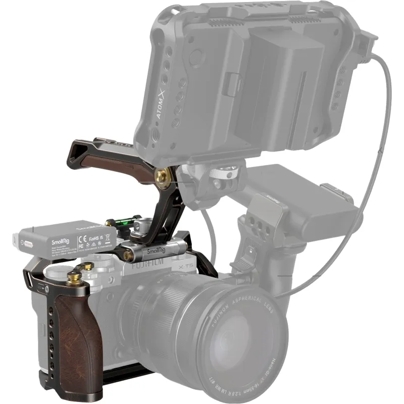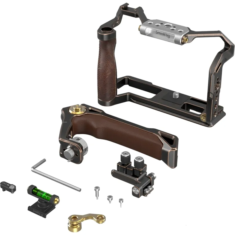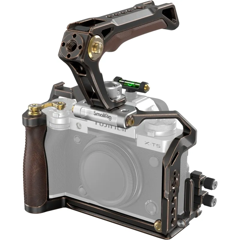 SmallRig Retro Handheld Cage Kit for FUJIFILM X-T5 3872 is designed to facilitate low-angle shooting, protect the camera, and provide accessory mounting points. The kit includes a cage, a top handle and an HDMI & USB-C cable clamp, and a hot shoe cover. The cage is endowed with a new punk style featuring a shutter button adapter frame and an ergonomic leather grip for improved shutter control and grip experience.