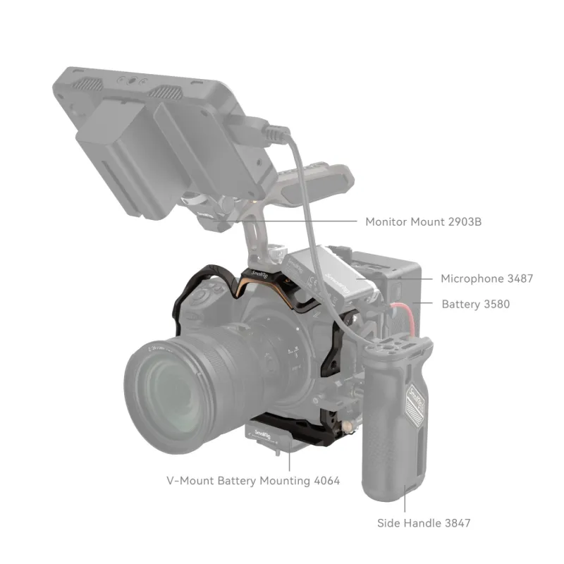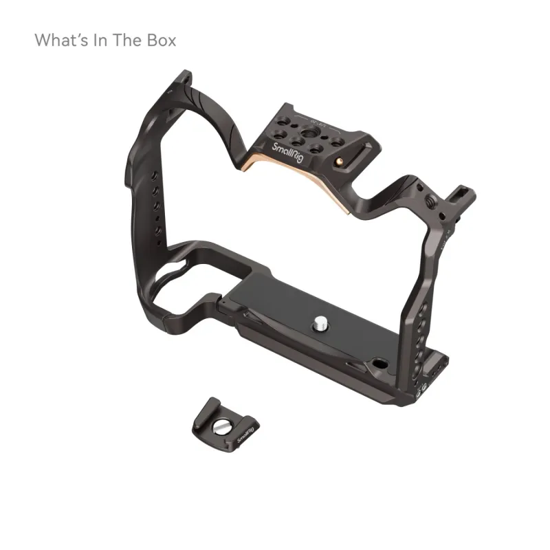 SmallRig Night Eagle Cage for Nikon Z 8 4316is designed to protect the camera and attach accessories. It features a brand-new design: gun brown curves interspersed with gold to supplement the classic style of the Nikon Z 8. The Cage adopts a three-point locking system: secure your Nikon Z 8 via a bottom 1/4 -20 screw and two M2.5 screws on both sides. The built-in pads prevent the camera from scratches. Unobstructed access to buttons, card slots, flip screen, and battery cover. The detachable Cold Shoe Mount for an LED video light or a microphone is fitted with a positioning pin to prevent deflection. Among its accessory mounting interfaces, 1/4-20 threaded hole, 3/8-16 threaded hole, and ARRI 3/8-16 locating hole support Side Handles2093, Top Handle 3765, Monitor Mounts2903&2904, Manfrotto Quick Release Plates1280&2458, Mounting Clamp for Portable Power Banks2336and mini V-Mount Battery Plate2987. Side 1/4-20 locating hole fits Single Rod Clamp3598and Magic Arm with Dual Ball Heads3873, and the NATO rail on the left quickly connects NATO Side Handles3847&4017. Besides, there are strap holes for Hand Straps3848&2456; and a QD socket for the QD strap buckle. The Arca-Swiss Quick Release plate on the bottom supports an Arca-type tripod or DJI RS 2 / RSC 2 / RS 3 / RS 3 Pro stabilizers for a quick switch between stabilizer, handheld, and tripod modes. A double-ended wrench is also included for easy disassembly and assembly.