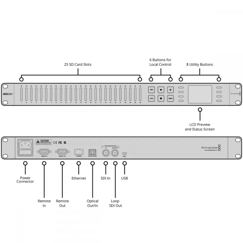The Blackmagic Duplicator 4K features 25 SD card recorders miniaturized into a single rack unit! The slots are designed to hold standard, common SD cards that are available anywhere. Each recorder features an LED indicator light for monitoring the status of the card. All the cards can be simultaneously formatted and, when they’re ready, the LEDs turn green. They also act as status indicators, lighting red during recording and flashing in different colors if cards are getting full, or to warn you of a problem.