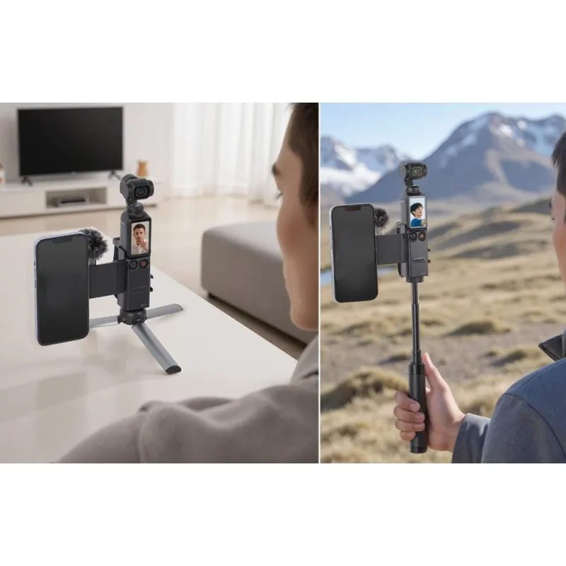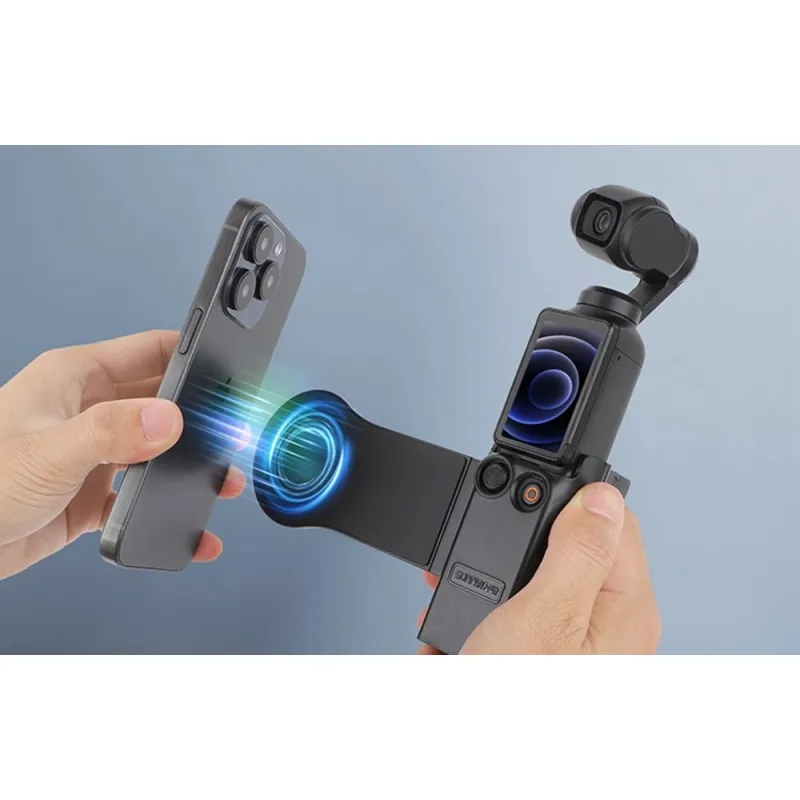 Sunnylife MJ991 — это практичный аксессуар 2-в-1, разработанный для камеры DJI Osmo Pocket 3. Он сочетает в себе силиконовый регулируемый ремешок для защиты от падений с удобной ручкой-удлинителем и прочным магнитным держателем для телефона, который поддерживает как вертикальную, так и горизонтальную съемку. Оснащенный холодным башмаком, он позволяет прикреплять микрофон или вспышку, а встроенный режим телесуфлера упрощает прямые трансляции и записи. Точные вырезы, мягкие прокладки и отверстие для шнурка обеспечивают безопасное использование, в то время как ультратонкое магнитное кольцо (0.44 мм) и совместимость с MagSafe позволяют осуществлять беспроводную зарядку.