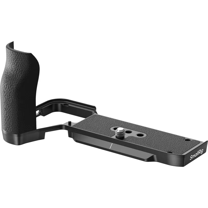 The L-shaped grip attaches to the camera with a 1/4-20 screw at the bottom, and the built-in silicone pads prevent scratches.