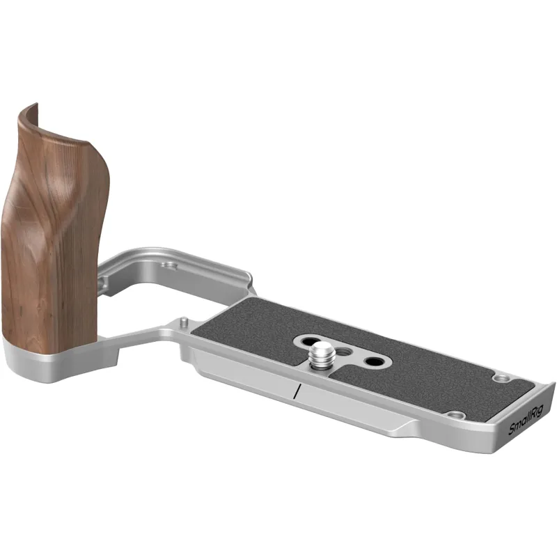 The L-shaped handle attaches to the camera with a 1/4-20 screw at the bottom, and the built-in silicone pads prevent scratches.
