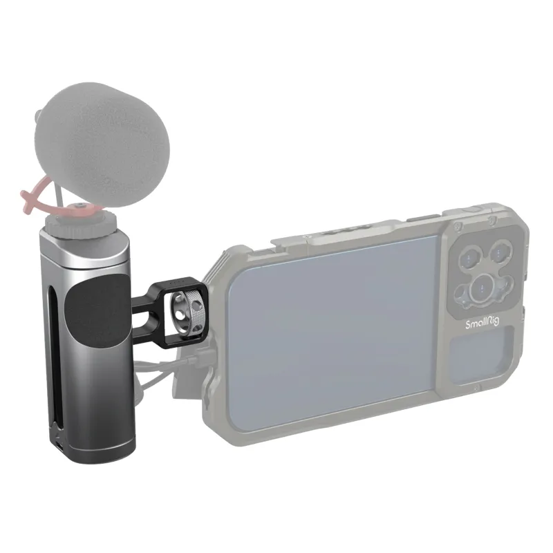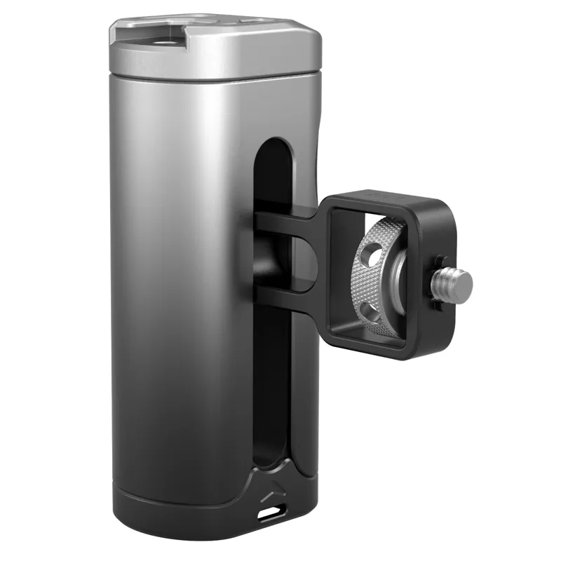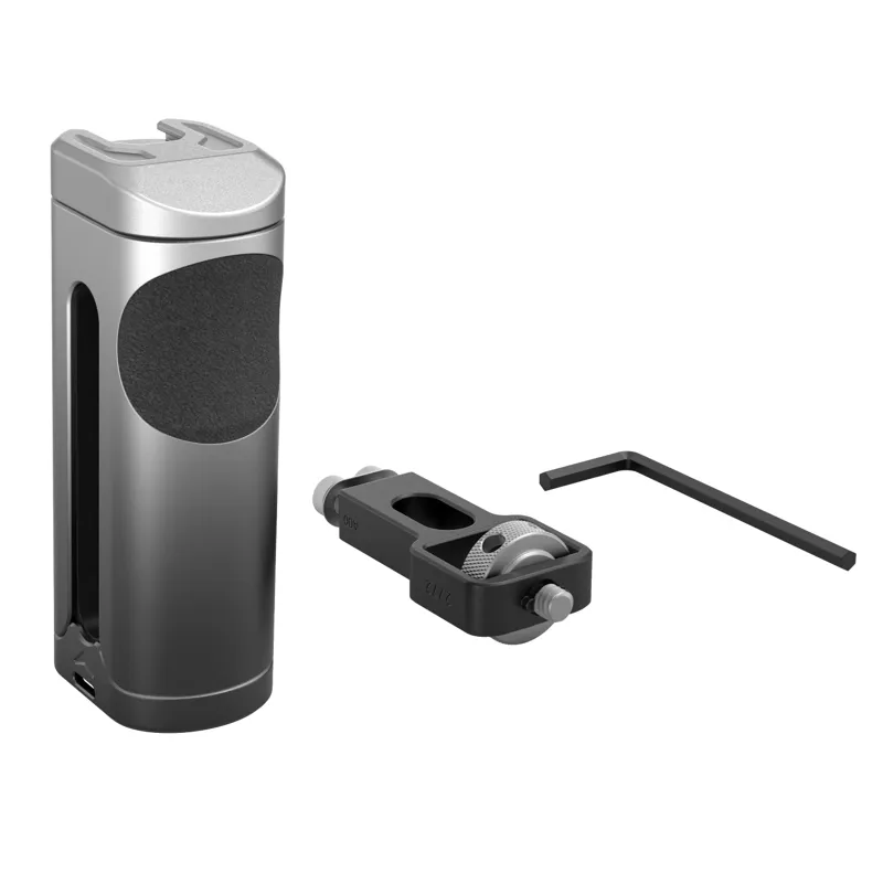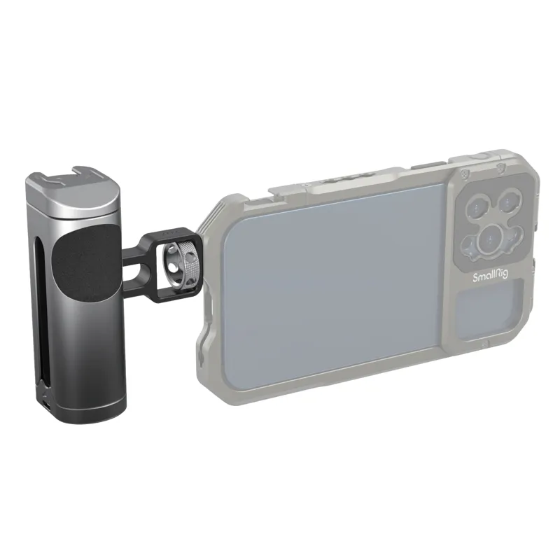 SmallRig Side Handle for Cellphone 3894, features a cold shoe mount on the top of the handle for attaching microphone or LED light for more professional shooting. The handle can be used on the left or right hand by adjusting the handle connector also can be moved up and down according to the center of gravity and position of accessories for a better grip experience. The surface of the handle is made of aluminum alloy with gradient anodizing, which makes it durable and visually impressive. Also, it comes with hole at the bottom for attaching hand strap to prevent accidental falling during shooting.