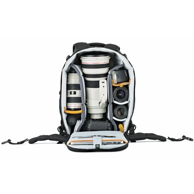 Flipside body-side access allows you to get your gear without putting the bag down. Carries DSLR camera kit or easily configured for a drone, such as the DJI Mavic. Padded interior top pocket for cords and chargers. A built-in All Weather AW Cover™ may be deployed from a pocket at the bottom of the pack for extra protection from rain, snow, dust and sand.