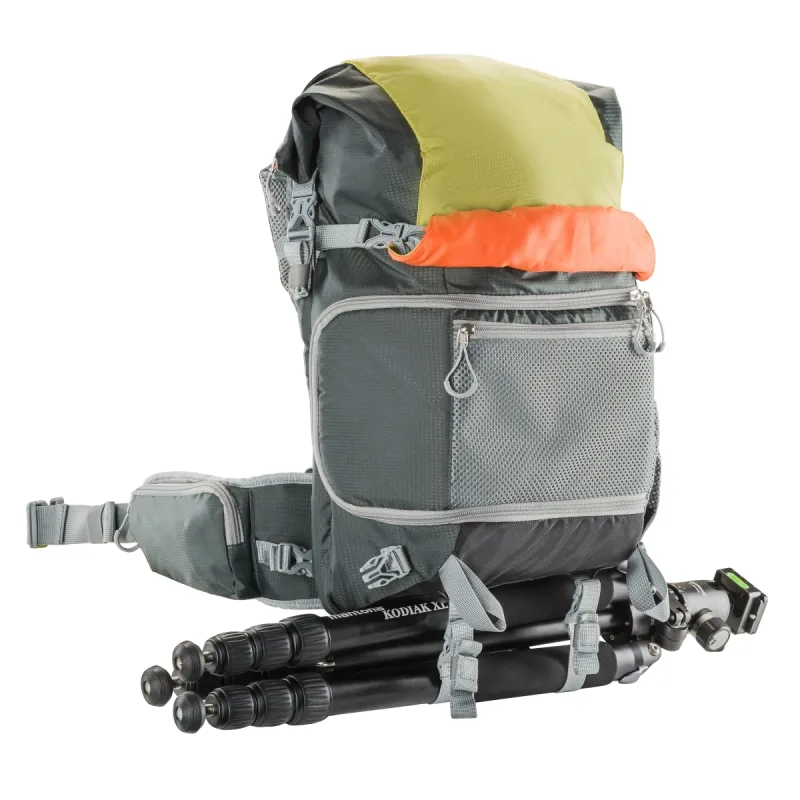 Доступ к отсеку для камеры можно получить спереди или сбоку. Спереди вы можете широко открыть отсек, чтобы оборудование было разложено перед вами. Однако для этого необходимо снять рюкзак. Вы можете взять камеру прямо сбоку и сделать снимок в мгновение ока. И даже не обязательно снимать рюкзак, достаточно выпутаться из плечевого ремня и подтолкнуть рюкзак вперед со спины. В нижней части рюкзака есть возможность быстро и легко прикрепить штатив. Петли можно затянуть так, чтобы штатив сидел надежно и был удобен для переноски.