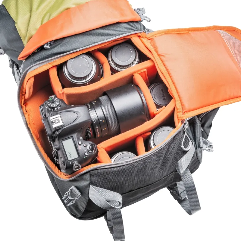 В нижней части рюкзака находится вставка для камеры. Его можно полностью снять. Таким образом, вы можете легко хранить оборудование. Вставка полностью ударопрочная и мягкая, с перегородками, которые легко и гибко перемещаются с помощью липучек. Таким образом, вы можете адаптировать рюкзак к ежедневно меняющемуся оборудованию. Верхняя часть рюкзака отделена перегородками и может быть использована для личного походного снаряжения, например, дождевика или провизии. Таким образом, вы будете хорошо подготовлены к длительным однодневным походам. У вас будет еще больше места для походного снаряжения, если вы полностью удалите вставку для камеры. Тогда ваш рюкзак для фотоаппарата превратится в идеальный походный рюкзак. Разумеется, в рюкзаке найдется место и для личных вещей и других аксессуаров - вспышек, фильтров, SD-карт или запасных аккумуляторов. Даже мелкие предметы, которые вы хотите иметь под рукой, можно отлично спрятать - для этого на поясном ремне есть небольшие карманы. Чтобы добраться до них, даже не нужно снимать рюкзак. Так что смартфон, ключи или кошелек всегда будут у вас под рукой.