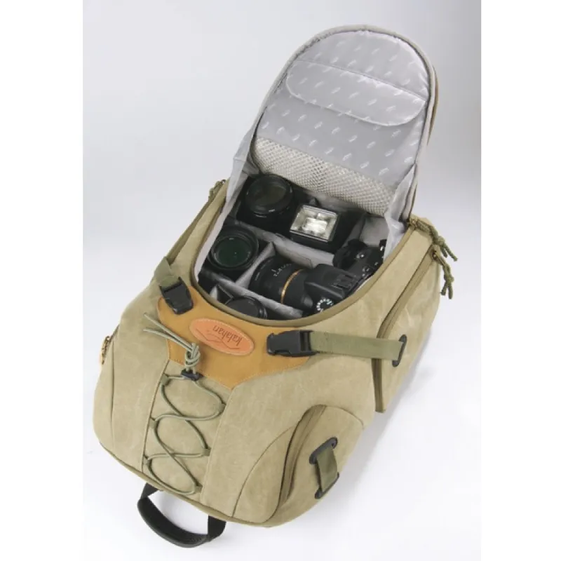 The Kalahari Kapako K-71 made of sturdy canvas is backpack and sling at the same time! So you can choose the method of wear individually. With two strap straps straight, it is portable as a normal backpack and with only one strap - which is then hung diagonally - as a sling optionally to wear over the left or right shoulder. The unused strap is simply stowed in the compartment between the back padding and the backpack. Both straps can be hidden there, ideal for transportation by car or plane. This avoids tripping hazards and protects the fasteners of the straps. The carrying function is taken over in this case by a comfortable and handy handle.