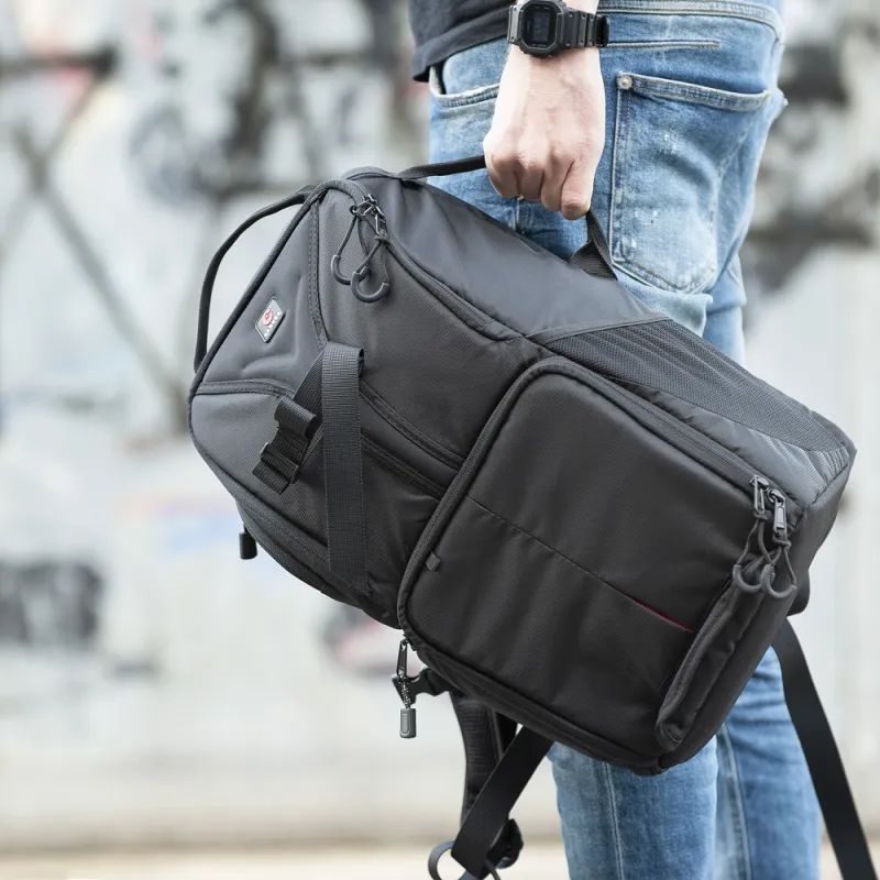Рюкзак Caruba Skydex 10 Рюкзак Caruba Skydex 10 компактен внешне, но в нем достаточно места для хранения личных вещей, небольшой зеркальной камеры или системной камеры с установленным объективом, пары дополнительных объективов, фонарика и 13-дюймового ноутбука. Для ноутбука предусмотрено отдельное отделение. Рюкзак также имеет достаточно отделений для мелких аксессуаров. Продуманная компоновка Skydex 120 имеет основное отделение, которое разделено на две секции. Доступ к отделению для камеры осуществляется через застежку-молнию спереди и сбоку. Внутренняя отделка сумки окрашена в красный цвет для хорошей видимости вашего оборудования, а мягкие перегородки являются съемными. Таким образом, вы можете сами выбрать расположение! Большая перегородка, отделяющая верхнее отделение от отделения с устройствами, также является съемной. Имеется петля для транспортировки штатива.