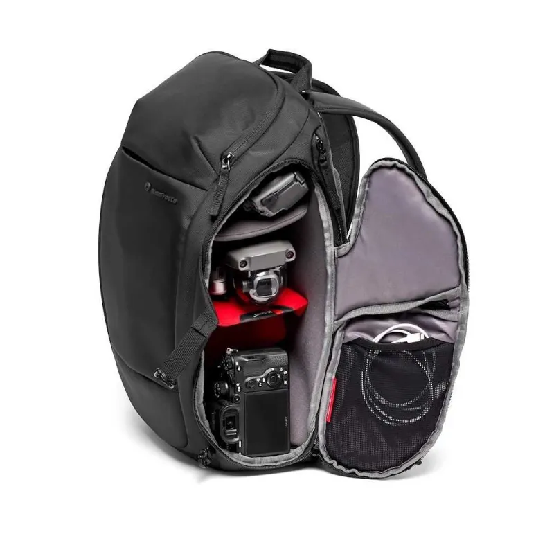 A must have compact, easy to carry camera and laptop backpack for your travels. The Manfrotto Advanced Travel Backpack III for DSLR or Mirrorless is an original bag that stores and carries your camera gear and media accessories. With an upper and lower section design reachable from just one side of the bag plus an expandable side pocket, you can customise this bag to fit your exact needs. It can store a DSLR such as a Canon EOS 5D mark IV with an additional 3-4 lenses depending on size (such as a 16-35/2.8, 24-70/2.8 or a 70-200/2.8). Alternatively, it can hold a full-frame mirrorless camera such as full frame Sony Alpha with a 70-200 mm f/4 plus DJI Mavic Pro 2 with multiple batteries and remote control.