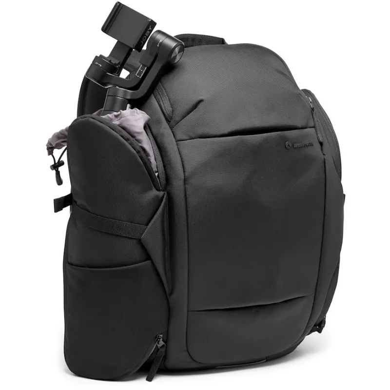 If more room is needed an extendable padded side pocket gives additional space for a travel size tripod or a handheld gimbal such as a DJI Osmo Mobile 2. In addition, the bag also comes with a smart front external tripod connection.