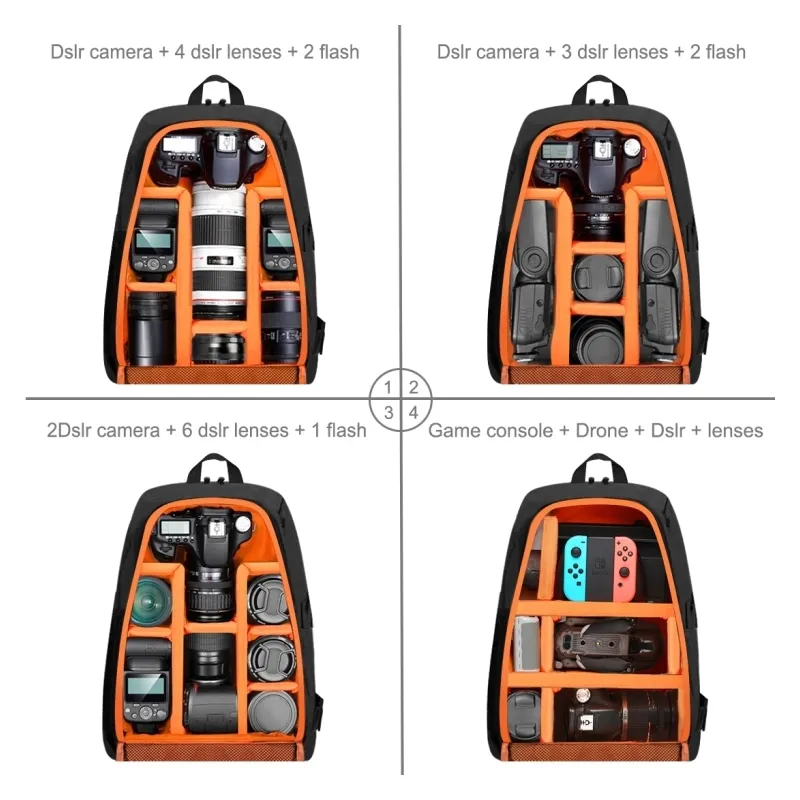 Рюкзак очень вместительный. Помимо камеры и специальных аксессуаров, в него поместится 15,6-дюймовый ноутбук, бутылка с водой, планшет, газета, смартфон, солнцезащитные очки, небольшое полотенце, зонт и косметика. Рюкзак также имеет внешний выход для шнура наушников.
