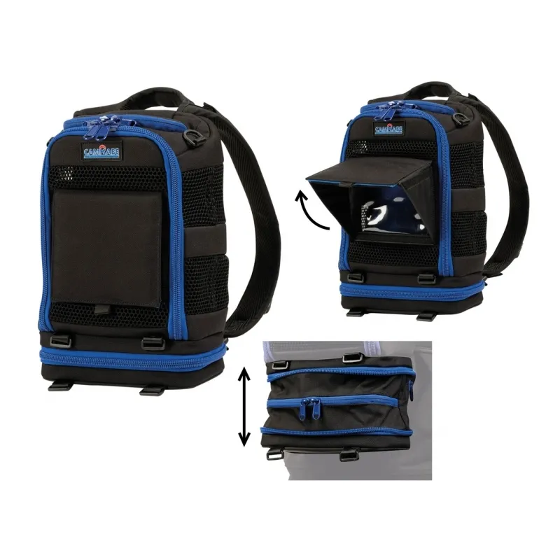 fabric combined with strong mesh fabric to allow heat, generated by the device, to escape. Openings with hook and loop fasteners allow you to guide the cables from one end of the bag to the other.On the bottom of the bag a special compartment - which is extendable up to 10 cm - is added for a battery and/or cables and accessories. In a closed off compartment with zipper you'll find the built-in rain cover and sun reflecting cover.