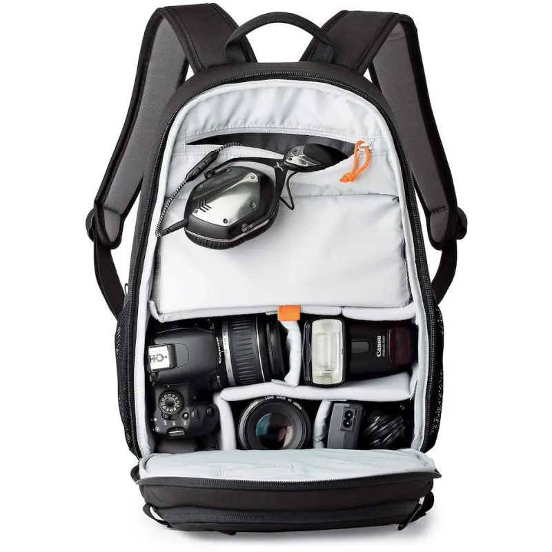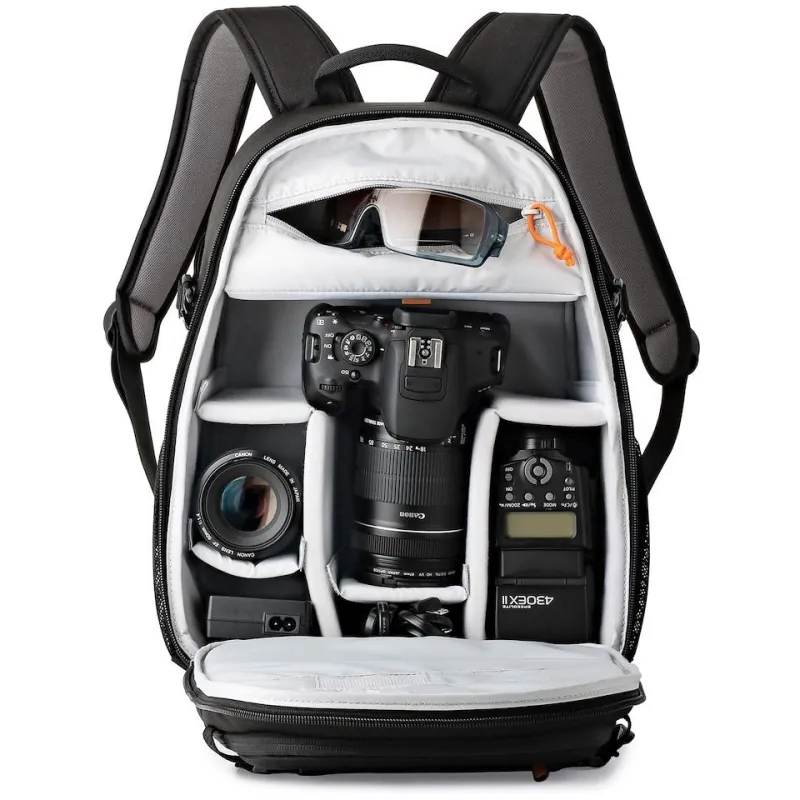 Вмещает зеркальный фотоаппарат с объективом (например, 18-135 мм), дополнительный объектив, вспышку