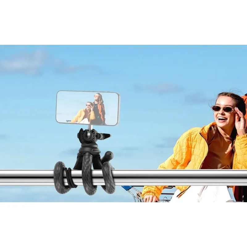 Штатив TP33 разработан с учетом универсальности - его складные, прочные ноги легко обвиваются вокруг перил, руля велосипеда, беговой дорожки или детской коляски. Он также может использоваться как настольный штатив или держатель для селфи. Изготовленный из алюминия и ABS-пластика, он может выдерживать до 0,5 кг подъемной нагрузки и до 1,000 сгибаний, обеспечивая долгий срок службы.
