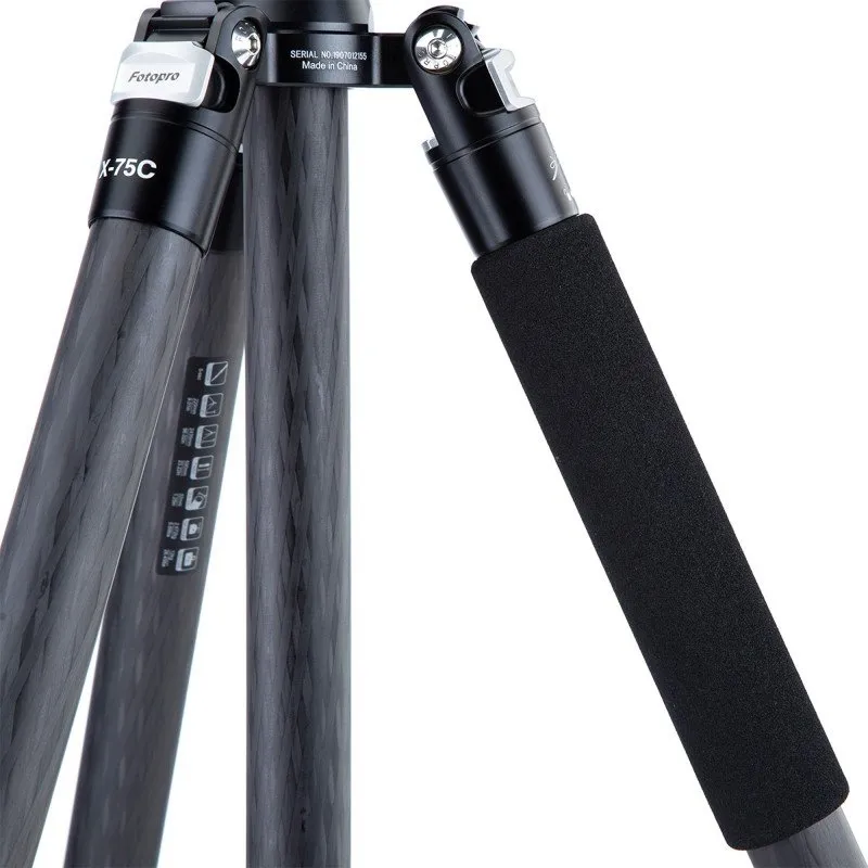 The Fotopro X-75C tripod with FPH-72Q ball head is the ideal choice for those who want compact dimensions in the transport position and a large maximum working height (as much as 243.9 cm!). The tripod has a three-stage leg tilt system, which consists of 5 sections. These are locked in place using a convenient swivel clamp system. The removable central column in combination with the unscrewable leg will allow you to create a telescopic monopod in seconds. The tripod is equipped with a spirit level, hook and rubber non-slip feet, under which adhesive spikes are concealed. The set also comes with a sturdy carry bag equipped with a special module allowing it to be extended. The manufacturer also provides a 6-year warranty. Main product features photographic tripod with professional ball head made of high quality aluminium as much as 243.9 cm maximum working height 59 cm length in transport position 5 leg sections extendable via a swivel clamp system maximum load capacity of 12 kg three-stage leg tilt system level for accurate positioning of tripod legs reversible central column for closer-to-the-ground photography included professional ball head Fotopro FPH-72Q head equipped with independent pan and tilt control knobs Arca-Swiss standard quick release plate protected by silicone lining double ball locking system to prevent any movement once locked head equipped with 2 spirit levels 2 360º pivot points on the head 360º scale for precision when taking panoramic shots quick-mount plate fitted with 1/4 "male thread two-sided tripod top screw allowing the installation of heads with 3/8" and 1/4" screw leg protected with silicone lining when combined with the central column and head allows you to quickly and conveniently create a monopod extractable hook to load the tripod rubber foot pads for good grip on flat ground possibility to remove the rubber feet, under which the spikes are hidden, which make it easier to work on uneven ground additional set of rubber feet pads included sturdy carry bag, which you can enlarge with the zipped module Even higher! The Fotopro X-75C will be an ideal choice if you are looking for a handy tripod that offers an unbeatable maximum working height. In its transport position, it measures just 59 centimetres. When all the legs are extended to their maximum, you get as much as 243.9 cm in height! The tripod has a three-stage leg tilt mechanism. Each leg consists of 5 sections, locked in place with a convenient swivel clamp system. The tripod is great for outdoor use as well as for home use. In-studio and in-the-field The legs of the Fotopro X-75C tripod are equipped with rubber, non-slip pads. Thanks to these, no panels or parquet floors will be scratched and the design will give your frames optimum stability. If you're working outdoors, simply remove the rubber feet and use the adhesive spikes. This will be ideal when the tripod is standing on compacted earth, ice, mud or sand. Professional ball head The Fotopro X-75C tripod is equipped with the FPH-72Q ball head with Arca Swiss standard quick-mount plate. It offers 2 levelers, making it easy to position the camera in the optimum position. The FPH-72Q head has two precise and smoothly operating knobs. One is used to lock and adjust the clamping force of the ball, while the other locks the movement of the rotating head base. There is also a 360º graduation scale, which will help take care of proper precision when shooting panoramic images. Turn a tripod into a monopod When filming and taking photos, there are often times when there is neither time nor space to set up a tripod. This is when a monopod comes to the rescue. Simply unscrew the leg of the Fotopro X-75C tripod, which is finished with a pleasant-to-touch lining. Connect it to the central column and discover completely new ways of framing with the telescopic handle. Upside down The Fotopro X-75C tripod with FPH-72Q ball head is a versatile tool for photographers who work on the go, in the studio or at home. The option to invert the central column will allow you to shoot closer to the ground, which is sure to be appreciated by product photography and nature macro enthusiasts. Comfort-and-convenience-of-working The tripod has a three-stage tilt mechanism for the legs, which are made up of 5 sections, locked in place with a convenient swivel clamp system. You can adjust its height to the unevenness of the terrain in seconds. If required, you will hang an additional load on the special extendable hook. The double-sided mounting element, which allows you to install a head on the tripod, supports 3/8" and 1/4" threads. This makes the whole design more versatile and you can connect even more accessories to it. Safe transport Included with the Fotopro X-75C tripod you will receive a zipped transport bag. It is made of durable material padded with foam to help protect your valuable equipment. Inside, there is also a pocket for small accessories. If you are taking another tripod with you or want more space for accessories, simply unzip the zipper on the side. The folding compartment will provide almost 14 cm of additional space. 6 year warranty Thoughtful design, top quality materials and precision workmanship ensure that the product will serve you for years. All Fotopro tripods come with a six-year warranty! Fotopro X-75C with ball head FPH-72Q is an excellent choice for professionals and enthusiasts, expecting Join the #photopro family As you embark on an amazing journey full of unique frames and shots, don't forget to bring a good tripod with you. Share your great photos and videos with us by tagging us on Facebook and Instagram using the hashtag #fotopropolska. See you on the trail! Specification model: Fotopro X-75C tripod with FPH-72Q ball head colour: grey number of leg sections: 5 material: carbon fibre minimum tripod working height: 229 mm maximum tripod working height: 2439 mm height in transport position: 590 mm maximum tripod load: 12 kg tripod weight: 2