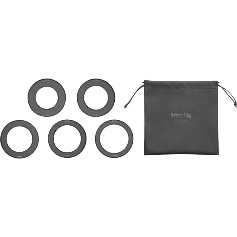 SmallRig Screw-In Reduction Ring Kit with Filter Thread (67mm/72mm/77mm/82mm/86mm) for Matte Box 2660 3410 включает в себя пять переходных колец и сумку-чехол для хранения. Переходное кольцо прочно привинчивается к передней части объектива и имеет резьбу для фильтров, позволяющую устанавливать на переднюю часть переходного кольца круговые фильтры, такие как переменные ND-фильтры и фильтры CPL. Кроме того, переходные кольца имеют антивибрационную кромку для предотвращения случайного отсоединения при использовании вместе с матовым боксом для обеспечения безопасности.