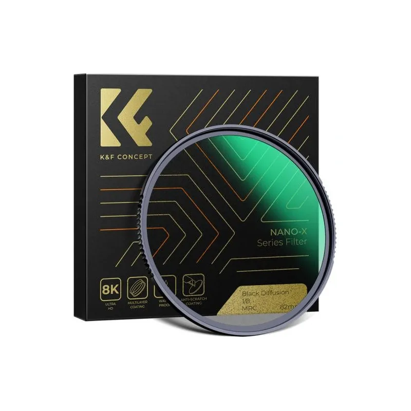 Фильтр K&F Concept 1/8 черный диффузор смягчает свет в фотографиях и видео, контролирует блики и улучшает текстуру кожи. Изготовлен из высокоточного японского оптического стекла AGC и имеет многослойное покрытие, обеспечивающее 87% пропускания света и минимизирующее отражения.
