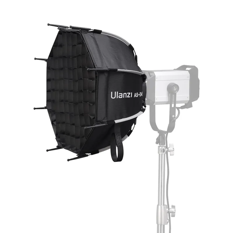 Софтбокс Ulanzi AS 045 Quick Release Octagonal Softbox With Grid 45 cm Bowens предназначен для быстрой установки и складывания. Он создает круглый световой пучок с мягкими краями, идеально подходящий для портретной и фэшн-фотографии.
