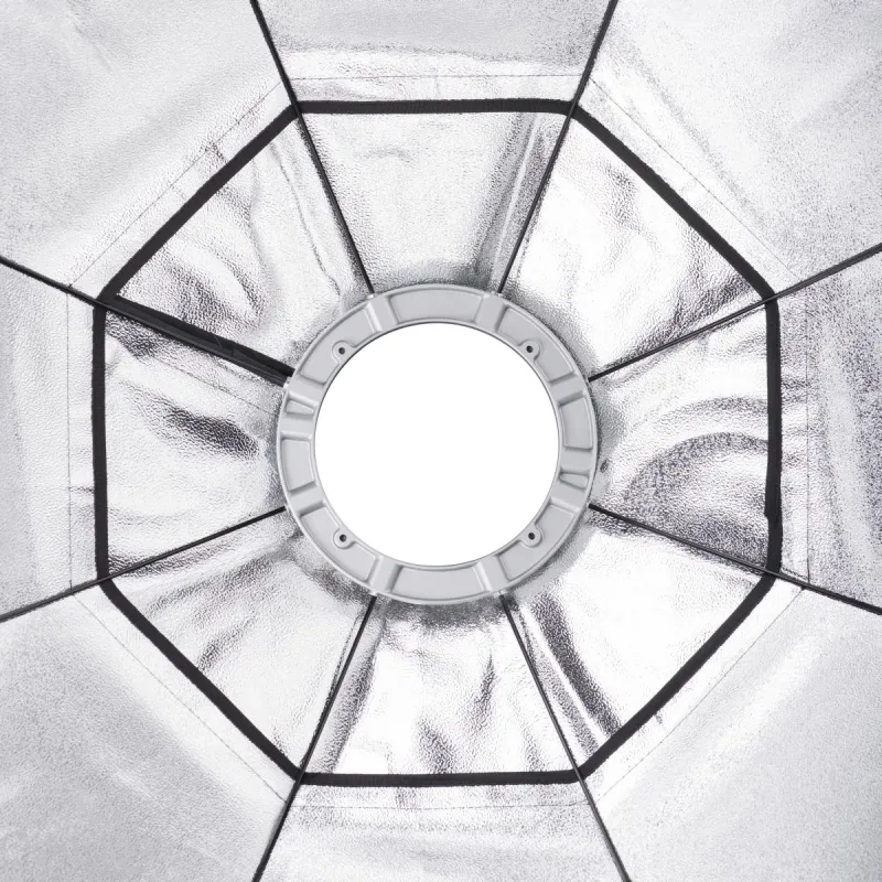 The high-quality Octagon Softbox with 140cm diameter is the ideal assistant for soft and even illumination. Whether beauty, people or glamour photography, whenever you want to achieve the most-possible glare-proof lighting, this Softbox is the right tool. Thanks to its innovative technique, it is easy to assemble in a few steps. The rear diffuser, which is also included, can be used optionally as to make the light softer. The front and rear diffuser are easy to remove by means of Velcro fastener.